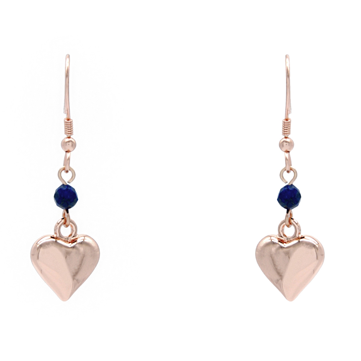Our gorgeous "Love & Strength" earrings flaunt beautiful genuine lapis lazuli faceted beads and a smooth rose gold finished heart suspended from sleek sterling silver hooks. Lapis is known to harmonize your heart and your mind when worn, providing you with a very special and on-trend fashion accessory. Nickel and lead free jewellery.